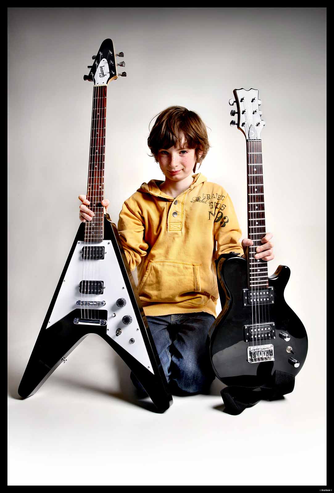 Iks met Flying V en Dean elektrische gitaar